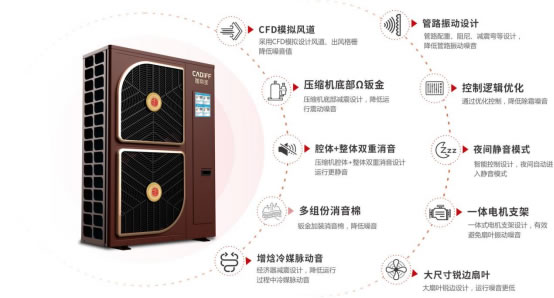 运用CFD模拟技术对风道和出风格栅进行优化,确保气流平稳,降低噪音值,噪音值比常规的机组低1-2dB,噪音品质更好;管路设计上在振动相对大的地方加配重、阻尼、减震弯等措施,降低管路振动嗓音;压缩机底部设计有减震的Ω钣金,降低压缩机的噪音向底板传播;通过优化控制,降低除霜、升降频时的噪音;压缩机采用腔体消音+整体消音双重消音设计,运行更静音;多种静音模式,标准静音、夜间静音、超静音技术,满足客户不同时间段对噪音的需求;外围钣金贴有多组份消音棉,降低噪音;一体式电机支架设计,有效避免扇叶振动嗓音;经济器设计减震钣金,减少喷气增焓的过程带来的冷媒脉动音;大尺寸+锐边扇叶,减少空气阻力,有效降低压力损失。